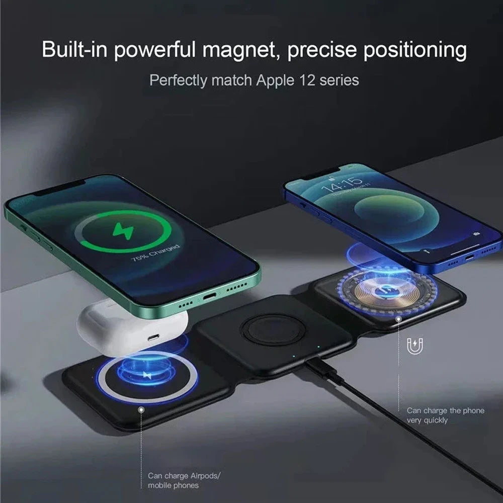 Electropulseproducts. The Magnetic Folding 3-in-1 Wireless Charging Station is designed for users who want to charge multiple devices simultaneously. Compatible with iPhone 16, 15, 14, 13, 12 series, iWatch, and AirPods, this charging station provides a safe and efficient power solution for your everyday devices.
