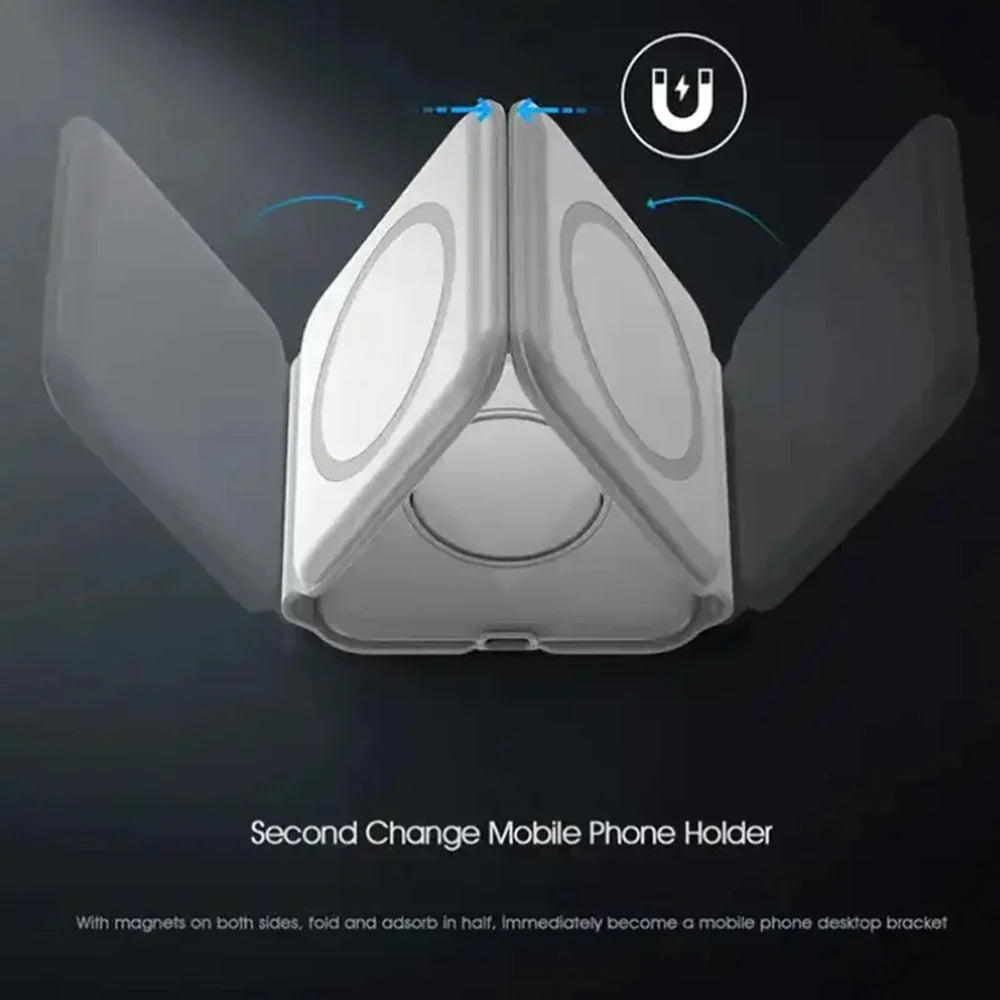This 3-in-1 charger features a foldable magnetic design, making it portable and perfect for home, office, or travel. Devices are securely held in place while charging, preventing slips or interruptions. The compact, modern design keeps your desk or nightstand organized while delivering fast charging to multiple devices at once.